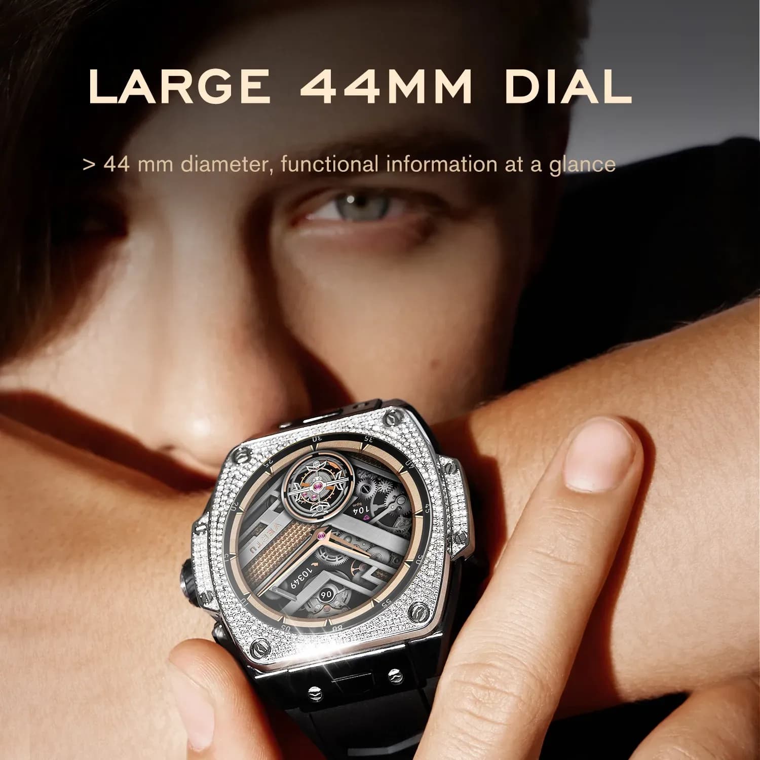 Большой циферблат диаметром 44 мм: 44 мм в диаметре, функциональная информация на виду.