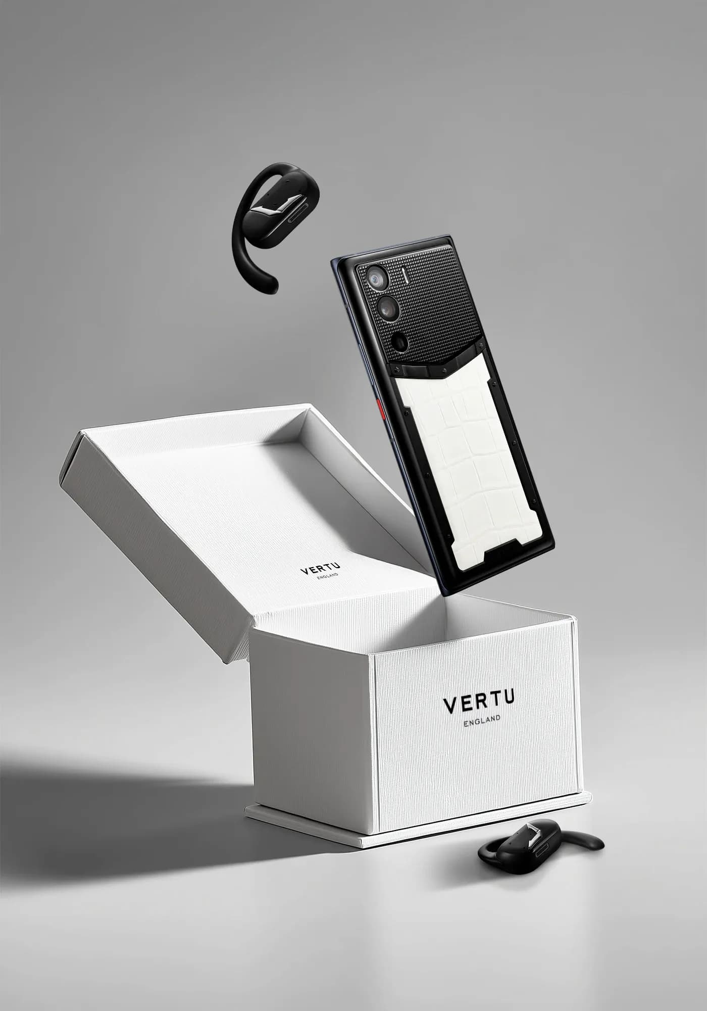 Включает в себя кремово-белый MetaVertu 1 и наушники Vertu Crush OWS.